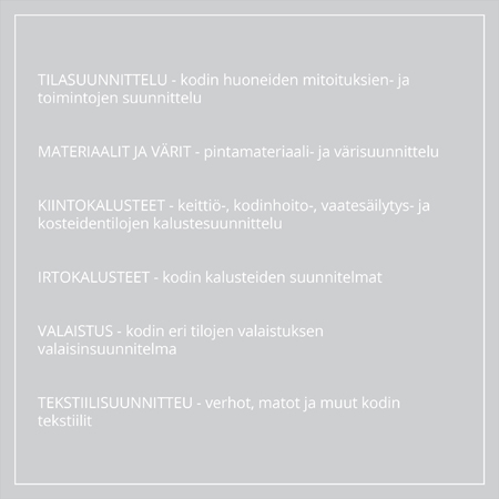 ottaa sisustussuunnittelun eri osa-alueista vain sen palvelun, johon kaipaat apua tai projekti voi pitää sisällään